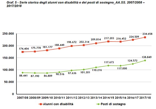 Qual è l’andamento rispetto agli anni precedenti? «Secondo i dati dell’Osservatorio Nazionale sulla salute delle Regioni italiane (Focus sulla Giornata Internazionale delle Persone con Disabilità, del 31 dicembre 2017) le persone con disabilità sono circa 4 milioni e 360 mila pari al 7,2% della popolazione italiana. Il Censis ha affermato che secondo proprie stime statistiche effettuate, le persone con disabilità raggiungeranno i 6,7 milioni nel 2040. Di conseguenza il numero degli alunni con disabilità a scuola è in continuo e costante aumento (come si può vedere dal grafico)».