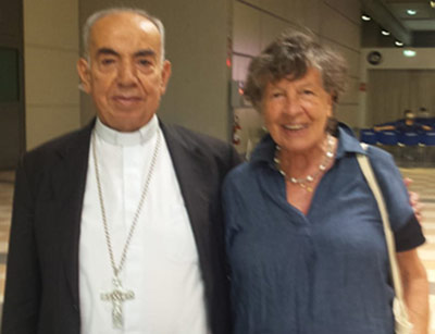 Presente al Meeting 2019, la professoressa ha incontrato i francescani di Pro Terra Sancta per valutare la fattibilità di un’azione specifica all’interno del progetto, fortemente voluto dal vicario apostolico di Aleppo mons. George Abou Khazen (nella foto con la docente), da fra Firas Lutfi e dal Muftì di Aleppo, Mahmoud Akam.