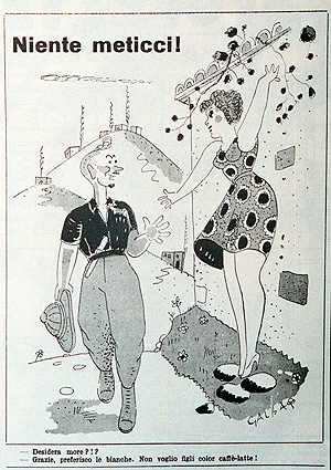 «Il tipo di donna che veniva preso in giro nelle vignette fasciste era quello delle potenze alleate, in particolar modo francese. Una donna senza seno, poco fascinosa, simbolo di una società decadente, aggettivo che veniva collegato spesso ai Paesi democratici. C’erano poi le streghe moderne che invece di cavalcare la scopa cavalcavano un aspirapolvere. Non risultano, almeno per quanto riguarda il materiale raccolto nella mostra, ironie nei confronti delle donne ebree mentre c’era, in difesa dell’impresa coloniale, la ridicolizzazione della donna africana che seguiva il più comune degli stereotipi razzisti. Veniva irrisa anche la donna intellettuale che veniva raffigurata sempre come poco femminile, mascolinizzata, brutta».