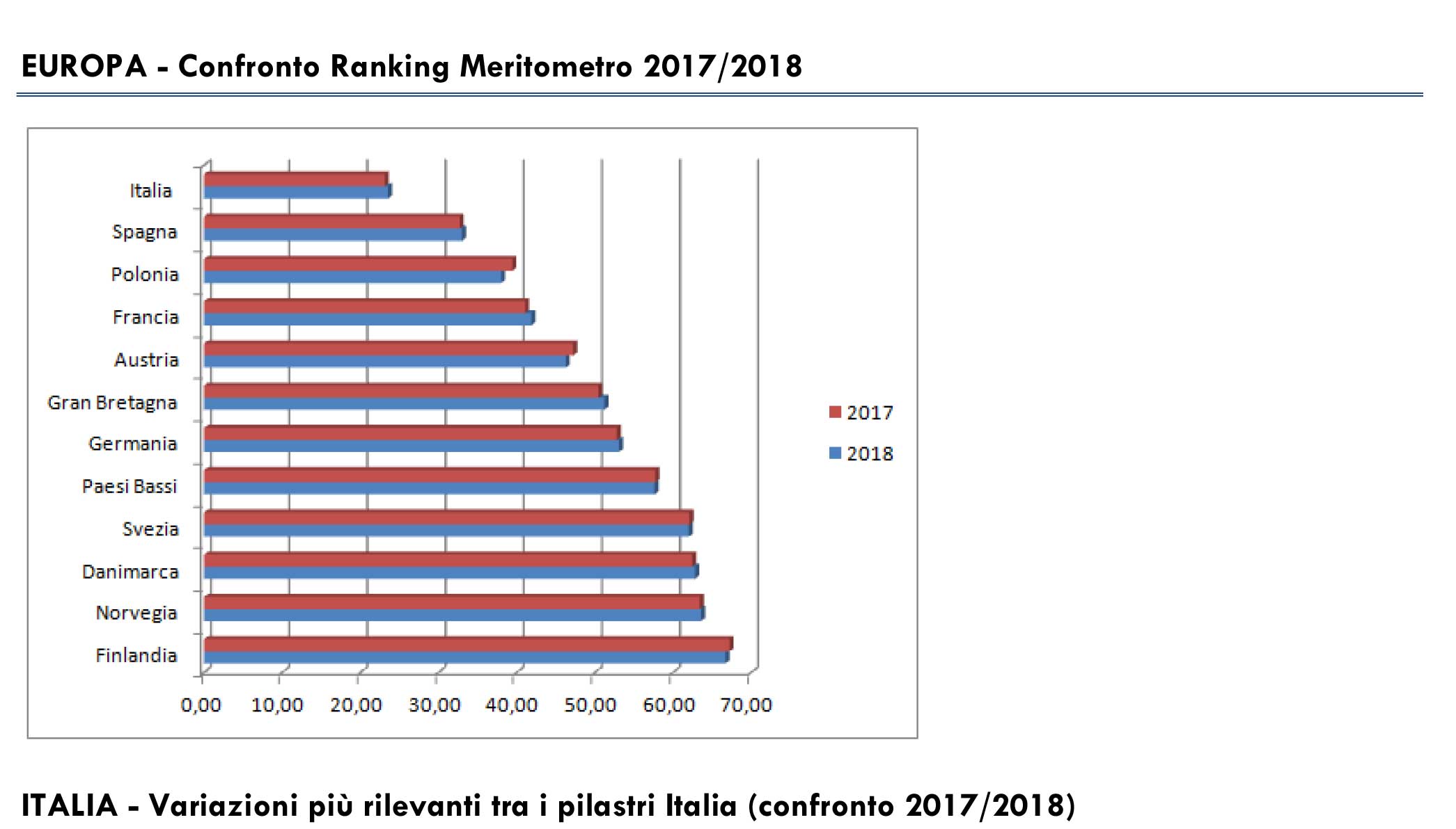 Al top della classifica i Paesi scandinavi (Finlandia, Norvegia, Danimarca, Svezia), al centro – con comunque ottime performance – altri Stati del centro Europa (Olanda, Germania, Gran Bretagna, Austria e Francia), e in fondo Polonia, Spagna e Italia.