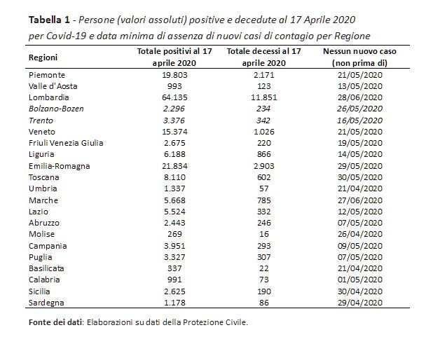 La fine dell’emergenza Covid-19 in Italia potrebbe avere tempistiche diverse nelle Regioni a seconda dei territori più o meno esposti all’epidemia: in Lombardia e Marche, verosimilmente, l’assenza di nuovi casi si potrà verificare non prima della fine di giugno, in Emilia-Romagna e Toscana non prima della fine di maggio. Nelle altre Regioni l’azzeramento dei contagi potrebbe avvenire tra la terza settimana di aprile e la prima settimana di maggio (vedi Tabella 1 sotto allegata).