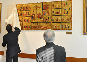 Un’opera che abbaglia, che incanta, grazie agli ori da icona bizantina. E che spinge la mente lontano, a riflettere sui drammatici momenti vissuti da Cristo sul Calvario. È stata svelata, lo scorso 21 gennaio nella Sala consiglio dell’Università Cattolica di Piacenza, l’opera “La Passione di Cristo” donata dall’artista senese Maria Rossella Battaglini. Erano presenti, insieme ai docenti, agli studenti e al personale dell’università, il vescovo della diocesi di Piacenza-Bobbio monsignor Gianni Ambrosio, il direttore della sede universitaria piacentina Mauro Balordi, l’assessore provinciale Massimiliano Dosi e l’assessore comunale Anna Maria Fellegara.