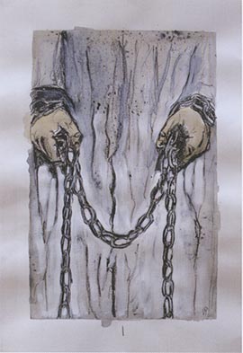 Le tre cadute scandiscono il percorso, e di particolare tensione spirituale sono l’incontro con la madre che abbraccia il bambino, ora corontato di spine in cammino verso il Calvario, e la raffigurazione della donna che asciuga con un panno il volto di Gesù. Infine la chiusura della via crucis riprende gli strumenti della Passione ricollegandosi alla prima immagine delle catene per ribadire l’atrocità insensata del giudizio umano contrapposta qui al sepolcro sullo sfondo.