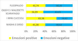 La media degli eventi emotivi presenti mediamente in ogni episodio è elevata (circa 90), così come elevata è la dominanza di emozioni negative in particolare nelle serie programmate per bambini scolari. In particolare, come si vede nella tabella a fianco, la serie che suscita più emozioni positive nei piccolissimi è I mini cuccioli, i maggiori riscontri negativi invece si riscontrano in Oggy e i maledetti scarafaggi.