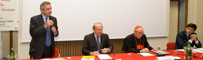 «Un incontro che abbiamo voluto per cogliere spunti per meglio agire e per meglio operare nello scenario dell’attuale crisi economica mondiale - ha detto il rettore Ornaghi introducendo i lavori -. Fiducia e speranza ci vengono chieste dal Pontefice per affrontare le difficoltà del momento. All’enciclica - ha aggiunto il Rettore - si richiedeva non solo di essere punto di riferimento per la riflessione, ma anche per l’azione, in quanto la dottrina sociale della Chiesa non è un elenco di luoghi comuni, di cose belle da dire, ma difficili da fare. La vasta eco che l’Enciclica ha avuto sui media dimostra che sta assolvendo in pieno il suo compito».