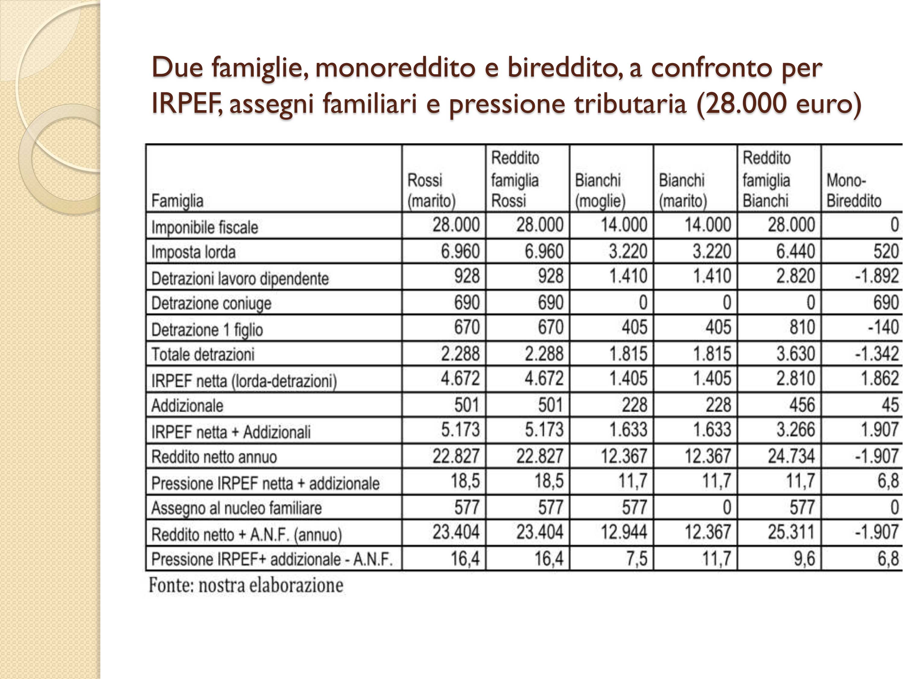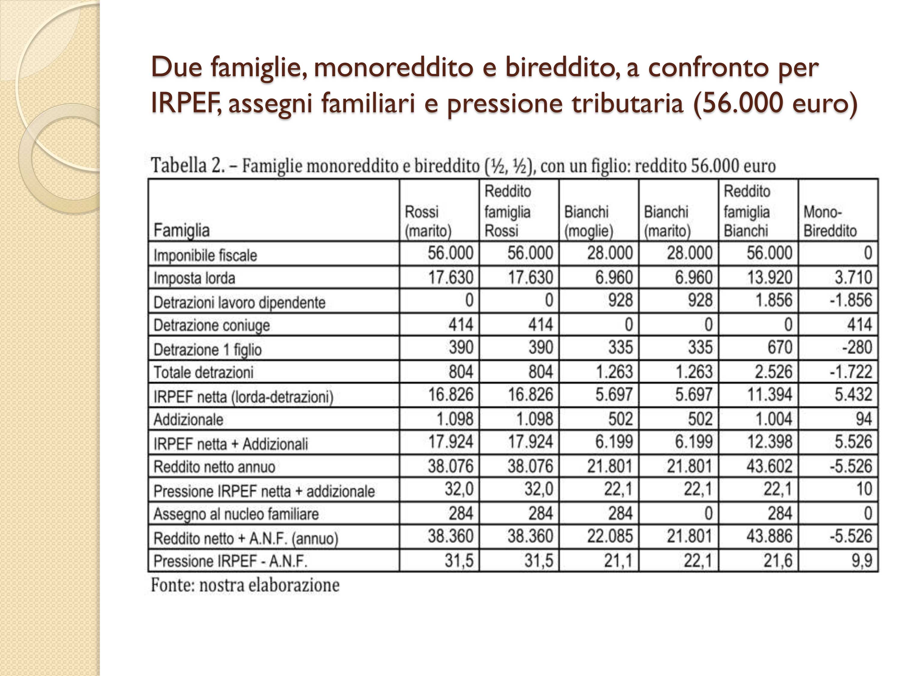«L'analisi dei due casi - dice Campiglio - offre numerose indicazioni, di cui la principale è l'eccesso di pressione tributaria sulle famiglie monoreddito rispetto a quelle bireddito: la maggiore pressione è stimata in circa 10 punti e circa 5.500 euro nel caso di un reddito di 56.000 euro (vedi allegato 1) ed è pari a 7 punti di maggiore pressione e circa 1.900 euro nel caso di un reddito di 28.000 euro (vedi allegato 2)». Poiché in entrambi i casi si tratta di famiglie con un figlio, continua Campiglio, è legittimo domandarsi se questo divario riveli un problema di equità. Per la famiglia bireddito la somma delle detrazioni di lavoro dipendente è più elevata di circa 1.900 euro rispetto alla famiglia monoreddito per entrambi i livelli di reddito ed è di poco maggiore la somma delle detrazioni per un figlio e dell'importo dell'assegno familiare (da 140 a 280 euro). L'apparente vantaggio, a parità di reddito e figli, delle famiglie bireddito rispetto a quelle monoreddito non è tuttavia scontato. «Il vantaggio economico di 1.900 euro è solo apparente - chiarisce l'economista - se la famiglia bireddito è obbligata a pagare un asilo nido, non potendo disporre di adeguate strutture pubbliche a prezzo davvero ridotto: in questo caso l'equità  orizzontale richiede un intervento preliminare e cioè che i costi per l'asilo siano deducibili. L'obiettivo dell'equità orizzontale richiede perciò una definizione più accurata, che consideri non solo il numero di componenti e loro età, ma anche altri aspetti, come le condizioni di offerta del welfare».