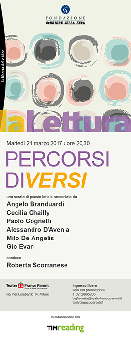 Lunedì 20 marzo l’Ateneo partecipa alla manifestazione Percorsi diVersi organizzata dal supplemento culturale del quotidiano di via Solferino “la Lettura”, in collaborazione con la Fondazione Corriere. Durante l’orario di pranzo l’attrice del Piccolo Teatro di Milano Lorenza Fantoni leggerà alcune poesie in tre momenti e luoghi diversi: alle 12.45 nel passaggio Gnomo, alle 13.30 nel Cortile d’onore e, infine, alle 14.15 nel secondo chiostro.