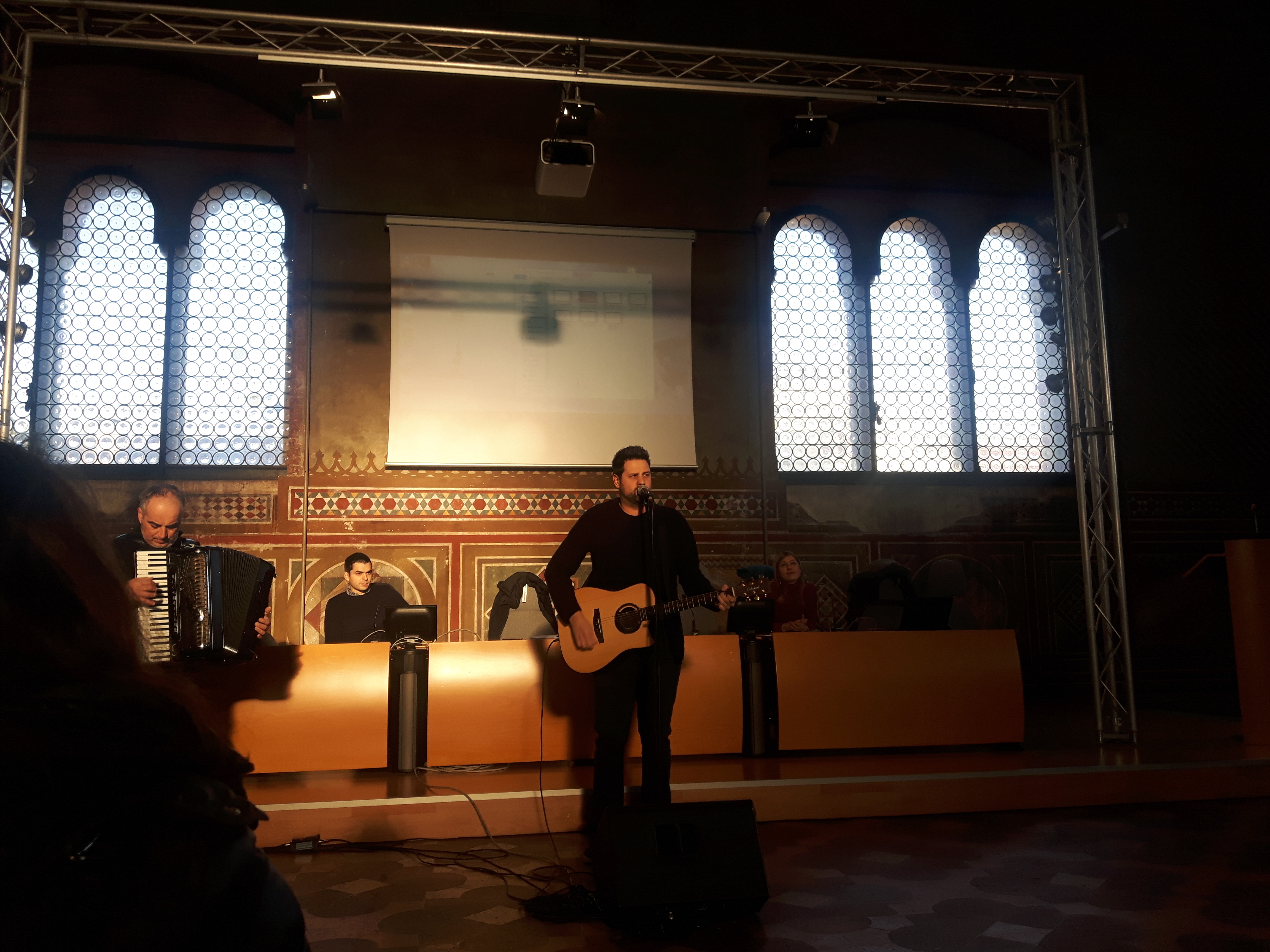Giovedì 21 dicembre il salone monumentale di Palazzo Gotico nel centro di Piacenza ha ospitato l’evento conclusivo dell’iniziativa: ad accogliere gli studenti delle medie inferiori e superiori, la musica del cantautore piacentino Daniele Ronda (nella foto a destra).