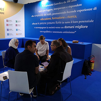 Presente al Meeting 2019, la professoressa ha incontrato i francescani di Pro Terra Sancta per valutare la fattibilità di un’azione specifica all’interno del progetto, fortemente voluto dal vicario apostolico di Aleppo mons. George Abou Khazen (nella foto con la docente), da fra Firas Lutfi e dal Muftì di Aleppo, Mahmoud Akam.