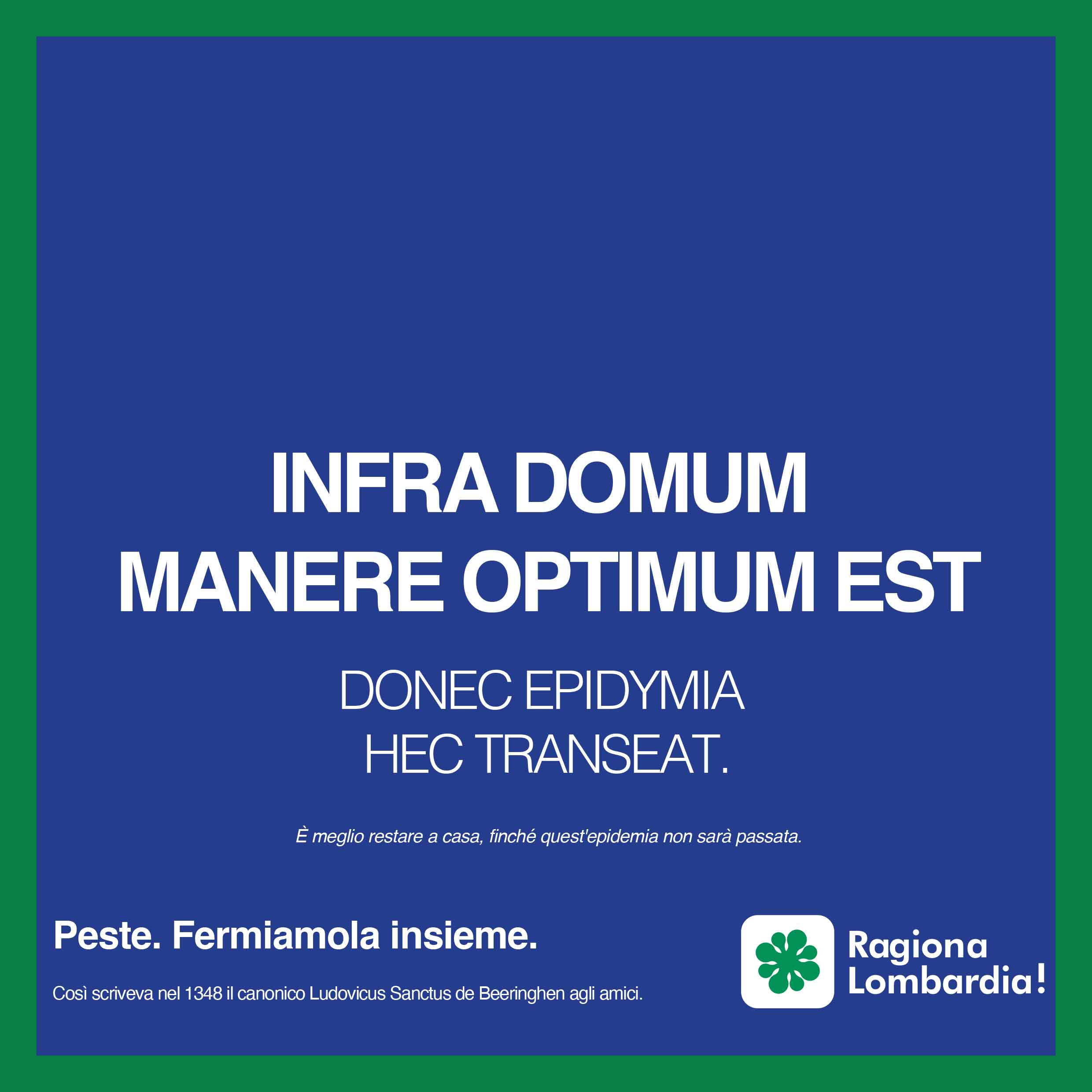 “Infra domum manere optimum est donec epidymia transeat”. Sono passati tanti anni da quando furono scritte queste parole, ma la sostanza non cambia: “È meglio restare a casa finché l’epidemia non sarà passata”.