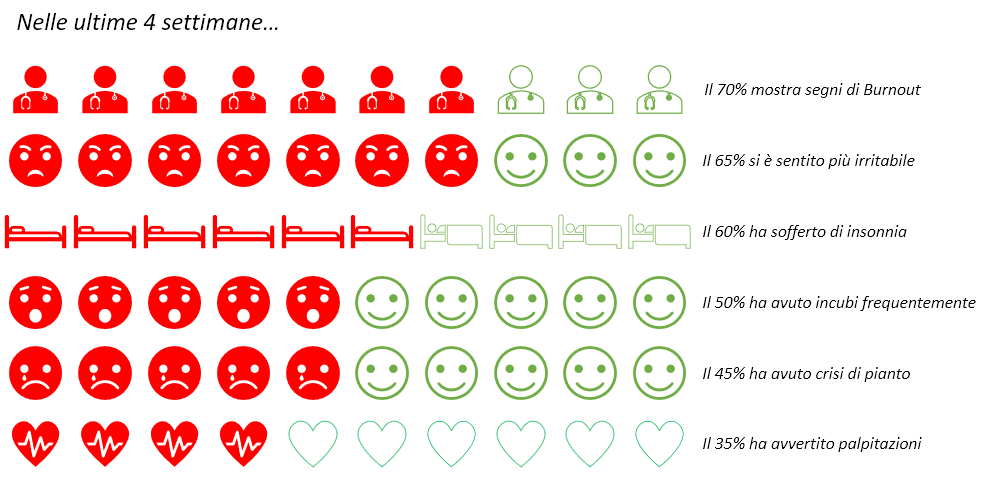 I risultati evidenziano in modo preoccupante come la salute psico-fisica degli operatori direttamente impegnati nella cura dei pazienti con diagnosi di Covid-19 sia stata messa a dura prova da quest’emergenza sanitaria: il 93% riporta di aver avvertito nell’ultimo mese almeno un sintomo di stress psico-fisico. In particolare, il 65% dei rispondenti ha dichiarato di essere sentito più irritabile del normale, il 62% di avere avuto maggiori difficoltà ad addormentarsi, poco meno del 50% di aver sofferto di incubi notturni, circa il 45% di aver avuto crisi di pianto e il 35% palpitazioni.